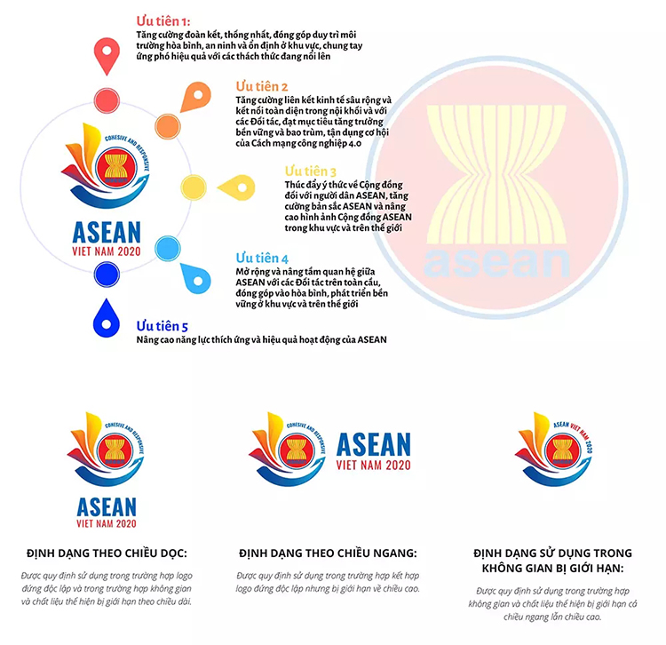 2020东盟年logo用色和谐。其中,黄色代表繁荣、乐观与快乐;红色代表活跃、能量与决心;蓝色代表和平、智慧与信心。2020东盟年logo包含两大内容:「齐心协力和主动适应」(英语:Cohesive and Responsive)。越南2020东盟年的定向为加强团结,统一,维持地区和平、安全与稳定环境;推动地区互联互通,面向人民,以人民为中心。