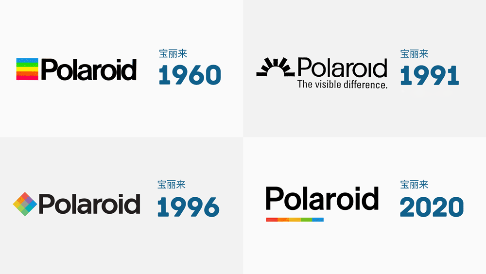 根据目前可以收集到的资料显示,从1960年前后开始,宝丽来的LOGO中就已经出现了五色线条的彩虹图标,一直到1991年后,宝丽来才将该图形LOGO替换为类似太阳光芒的黑白图标(这个版本目前没有发现彩色版本),短暂的使用了5年时间后,从1996年回顾到彩色图标中。从那时起,宝丽来的图标从之前五种色彩扩展为九色,图形也由条纹变为九宫格。