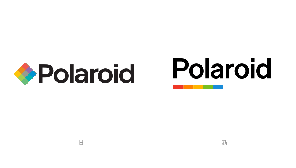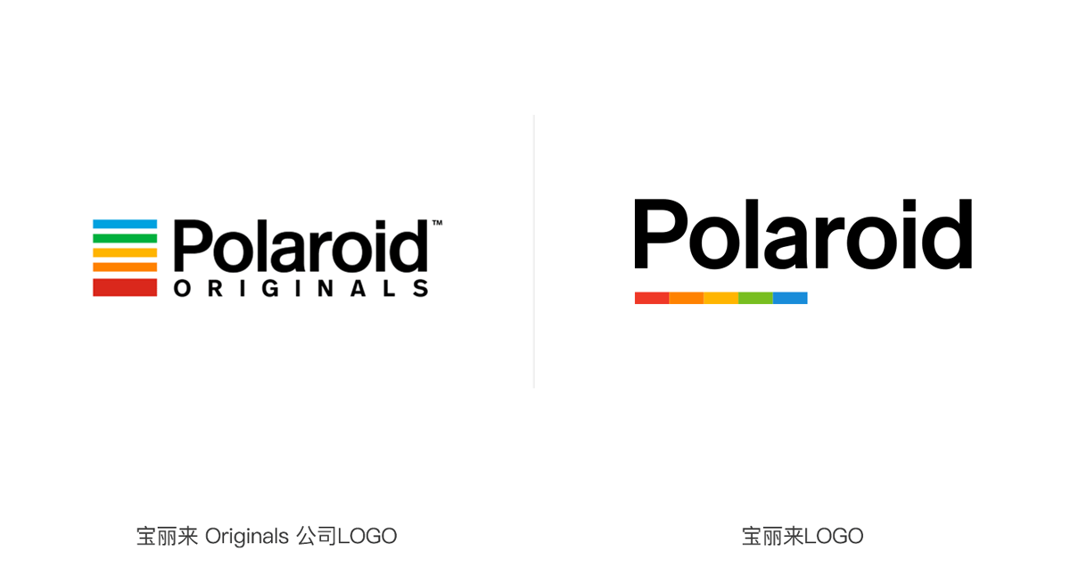 在2017年全新组建的 Polaroid Originals 公司LOGO中,宝丽来为了致敬上世纪60-90年代使用的彩虹图标,然后并展开彩条间隙,形成抽象的宝丽来拍出的照片瞬间。