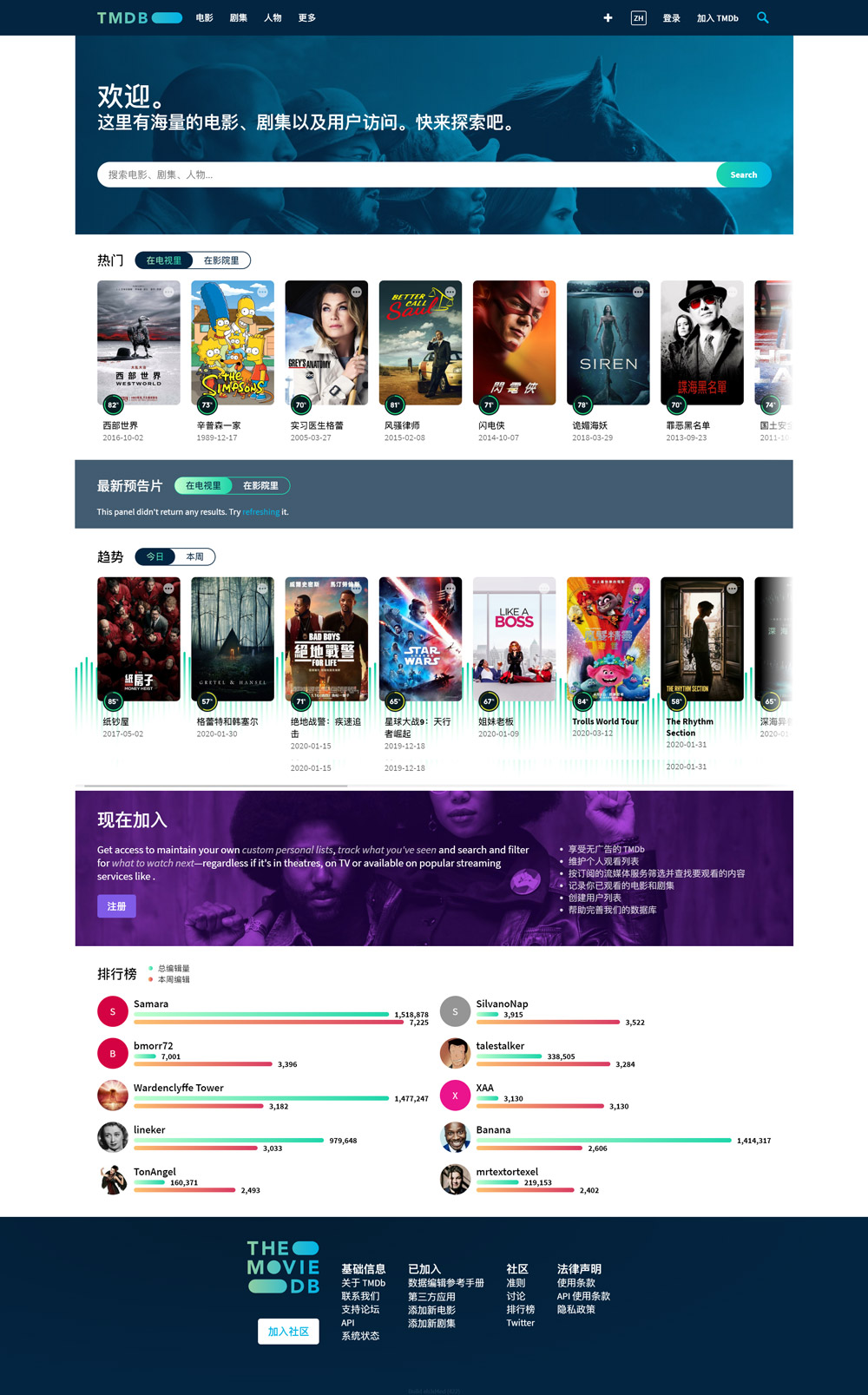 电影数据库(The Movie Database,TMDb)一个公开的影视数据库网站,由Travis Bell 于2008年创立。TMDb资源内容非常丰富,拥有完整的电影、电视节目、演员和剧组数据,可以称为电影电视界的维基百科,所有条目用户都可以参与创建和编辑。截止2020年3月,TMDb共收录了534266部电影、91049部电视节目(129033个电视节目季数、1931173个电视节目集数)以及1617604名人物。