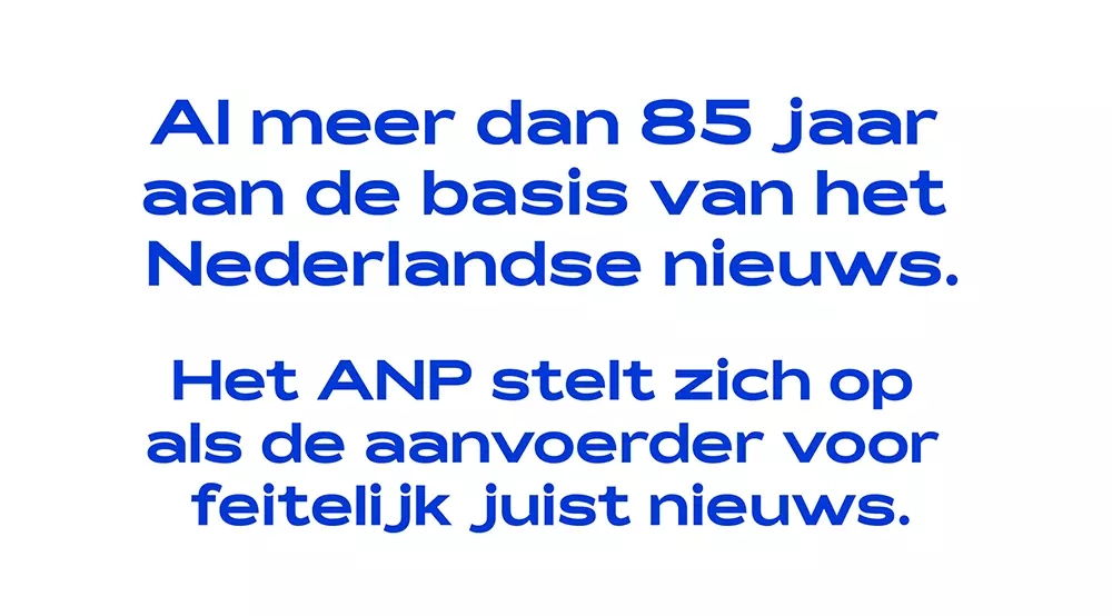 今年年初,ANP与海牙创意机构 Vruchtvlees 合作开发的新视觉形象,彰显了ANP独立新闻社的重要性,并使ANP的内容更明确清晰。作为荷兰最大媒体机构,无论你是收听广播,观看电视,还是阅读手机新闻,这一切都来自经过事实检验的新闻源——ANP,也就是一切源头的开始。